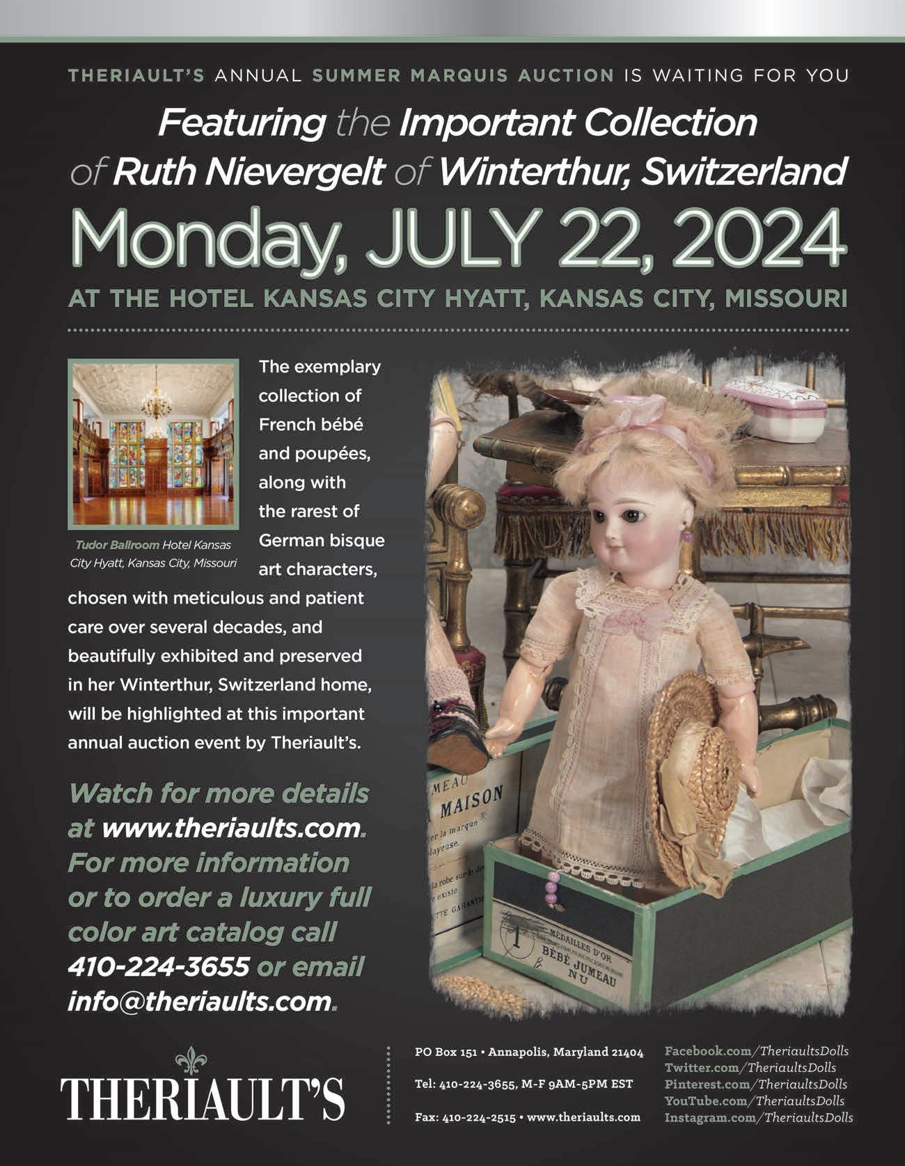 Antique DOLL Collector is not responsible for any inaccuracies in advertisers’ content. An unsolicited manuscript must be accompanied by SASE. Antique DOLL Collector assumes no responsibility for such material. All rights including translations are reserved by the publisher. Requests for permissions and reprints must be made in writing to Antique DOLL Collector ©2024 by the Puffin Co., LLC.