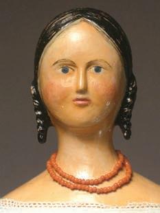 1. 22 1/2” Unique, wooden shoulder head lady, circa 1840, carved ringlets w/ rear bun, orig. finish except for light touch up at sides of forehead, cloth body, leather arms, antique clothing. $4,200.
