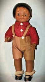 This darling pair of black children are dressed in cotton costumes. The pair were designed to sit on a shelf or a mantel. This 12-inch girl is wearing a floral print dress with an ivory-colored bib apron. On her feet, are painted black side button high top shoes. Her facial painting is expertly rendered. The doll’s black hair has corkscrew metal curls on the sides. She has her original booklet. Her male companion is accessorized with a cut metal sailboat. You wonder where his imagination is taking him on his toy boat. Both are signed on the back of their right leg, “Young/ copyright 86.”