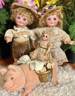 A darling pair of 9” Armand Marseilles 323 Googly siblings in excellent condition are enchanted by a Candy Container Piggy carrying an adorable jointed bisque dolly on it’s back! Googlies $1185 Pr. Candy Container $795
