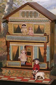 13) 17” Bliss House w. Balcony - Original papers in & out, bright color & high shine, some age, re’plcd. steps. $695
