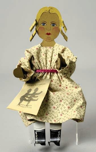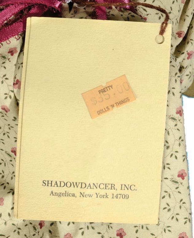 This 111⁄2-inch youngster is irresistible. She looks as if she were kissed by the sun. Her blond striated hair is parted in the middle with two sausage curls on opposing sides. Her lovely blue eyes have extra coats of paint making them slightly convex. She has rosebud-shaped lips and a chin demarcation. This pretty child is wearing a beige-pink floral print dress with a square neckline. She is the only one I have seen with a painted undergarment. The girl is wearing painted fashionable side button high-top shoes. Her beige socks come to her thighs with a darker painted line marking her knees. She is signed “Young.” A booklet is attached with double shadowdancers on the cover and a price tag on the back “Pretty//$35.00//Dolls N Things.”