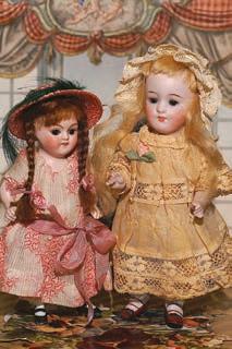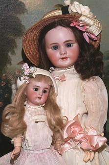 7) French ‘DEP’s ‘- original Jumeau bodies. Left: 13” Little Sister in original dress & hip length French wig. $495; Right: 23” Big Sister w bl.sl. eyes, dewey bisque, dense Factory Wig & Pate, fine original clothes. $850