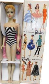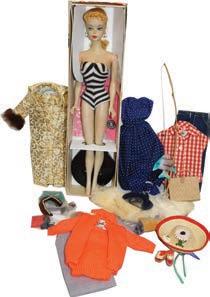 Beautiful #1 Barbie in box with original stand, comes with TM tagged Gay Parisienne (not complete), Evening Splendor, Picnic Set, Suburban Shopper, Resort Set, Floral Petticoat, Peachy Fleecy, Winter Holiday, Sweater Girl $13,995.