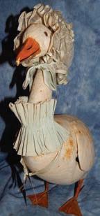 An 18-inch painted sheet metal mother rabbit is costumed in an ecru cotton blouse, a red scarf with polka dots, a blue floral pattern cotton skirt, and apron. It is interesting that the male is dressed in wool and the female in cotton. Perhaps they were produced at different times, or the company had a shortage of certain fabrics. Their 111⁄2-inch rabbit child is wearing a cotton sailor-style outfit. All three pieces are signed in white, “Young/ copyright ’88.”