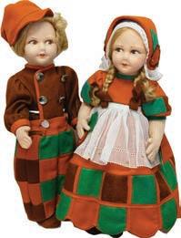 15” Pair of Norah Welling All Original Dolls in brown & green felt outfits, mohair wigs, beautifully painted $595.