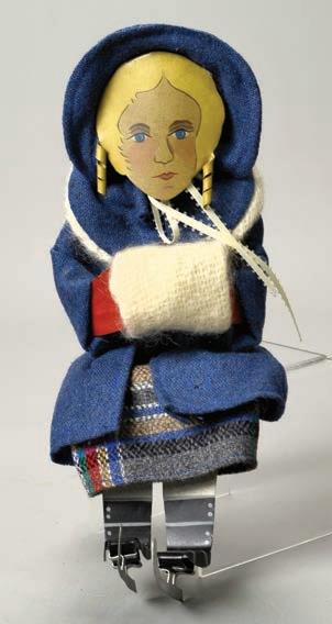 COUNTERCLOCKWISE FROM LEFT: This female skater is wearing a beautiful handmade costume. Her boot skates reflect the early evolution of ice skates. Her bonnet frames her lovely face and beautiful blond spiral curls.