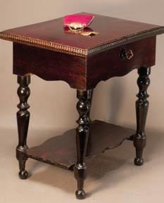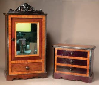 3. Set of antique doll furniture consisting of an inlaid wood armoire and matching chest, being sold separately. Armoire is 15” tall, $625. The chest of drawers is 6 3/4” tall, $325. Next comes a high quality, antique wooden table with lid that lifts to reveal a silk-tufted storage compartment, complete with an attached mirror and orig. key. Table top is 9 3/4” tall. $975.