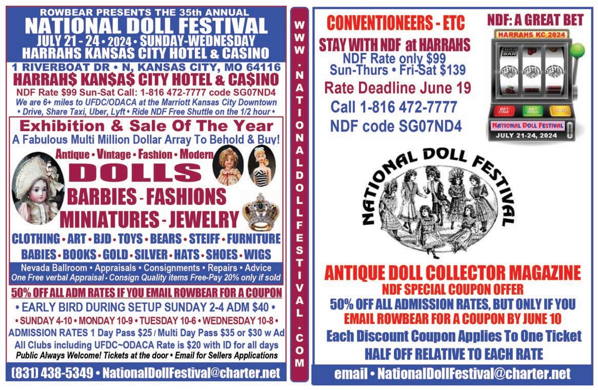 21-24 ~ Kansas City, MO. The 35th Annual National Doll Festival. Harrahs Kansas City Hotel and Casino. 1 Riverboat Drive, North Kansas City. Rowbear Lowman. 831-438-5349. NationalDollFestival@charter.net.