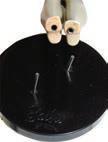A 16-inch seated female skater is costumed in a blue hooded wool coat with a knitted white trim collar and ribbon. It is accessorized with a knitted muff. Beneath the coat, the girl is wearing a wool-striped pattern skirt in blue, yellow, red, white, and black. The clothing was hand-crafted from specifically selected fabric. Her skates have metal blades. The skater’s hair and facial painting is skillfully done with a matte finish. Particularly interesting is the creation of sheet metal blond hair with spiral curls on opposing sides. What is amazing is the fact that the curls were cut from the same piece of metal rather than attaching separately. She comes with a string tag detailing the company’s history. Her seated partner is a 17invh male skater costumed in wine-colored wool trousers and a gray coat with a blue and red plaid pattern. Around the neck is a navy blue scarf. His face is painted with brown side glancing eyes. Both are signed “Young/copyright ’87.”