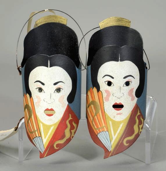This identical 61⁄2-inch pair of cut tin and hand-painted luminaries represent Japanese Geisha girls. A source of light placed on the inside caused the mouth and eyes to glow. Their hairstyles are pulled to represent full Geisha status rather than that of an apprentice. The hair was washed once a week and wigs reworked.
