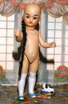 8) Extremely Rare 7” Large Oriental All Bisque - glass eyes, silk clothes, Halbig w knee length Queue, lovely amber tint, ‘over the knee’ white stockings,pointy Blue Slippers. $1495 9) Elusive Glass Eye 12” Kestner ‘206’ Character - a rarely seen ca: 1909 cabinet gem in Factory Wig, Pate & delicate Original Clothes. So special. $10,000 only $5250