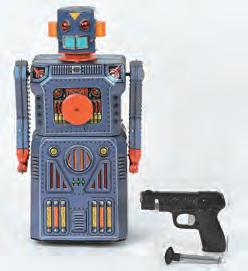 condition. It was a fresh, clean example with its original box andits key still enclosed in its factory bag. It changed hands for $4,305. Also noteworthy was a postwar comic character production from Marx’s Japanese subsidiary, Linemar. Known as “Mechanical Popeye,” the 5inch-tall windup toy depicting the scrappy cartoon sailor was irresistible when paired with his rare, vibrantly-hued original box. All original, it easily surpassed high estimate at $4,428.