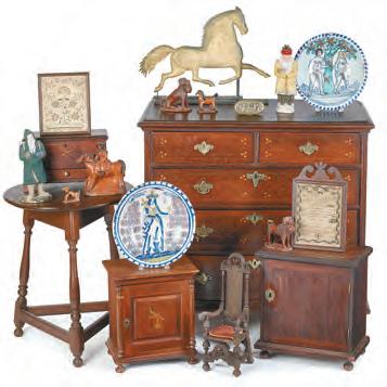 folk art. Rarities are found throughout the collection, such as an important Harrisburg silkon-gauze needlework sampler dated 1807, wrought by Elizabeth Finney at Mrs. Leah Meguier’s School. There is also a group of Charles II stumpwork. Nearly all examples of early Chester County furniture styles are represented: a Chippendale walnut tall case clock, ca. 1775, has works signed by B. Chandlee, Nottingham, with an inlaid case adorned with pinwheel and tulips. A Chester County Queen Anne walnut tall chest, ca. 1760, is decorated with arched herringbone inlaid drawers and raised side panels. Another highlight is a Chester or Lancaster County Chippendale “parrot” inlaid blanket chest, ca. 1760, featured alongside a miniature version, ca. 1810. One of several fine spice chests, a rare William and Mary cedar chest, ca. 1725, is decorated on all sides with compass inlays of potted tulips and is most likely an early example from Philadelphia. Eighty lots of exceptional English and Dutch Delftware is headlined by four English plates of Chester County interest, all dated 1738 and initialed WG for William Gregg. These plates belong to a small group of known Delftware