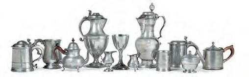 The Herr pewter collection is headlined by a trove of rare Philadelphia finds; a pewter flagon, attributed to Johann Philip Alberti, is engraved “Georg Kirchen, 1763.” Also attributed to Alberti is a pearshaped footed teapot, ca. 1770. Pieces by famed Philadelphia pewterer and patriot William Will include an elegantly proportioned teapot, ca. 1780, a quart mug, covered sugar, and a creamer, all bearing his touch mark. A rare teapot, late 18th century, is possibly the only example known bearing