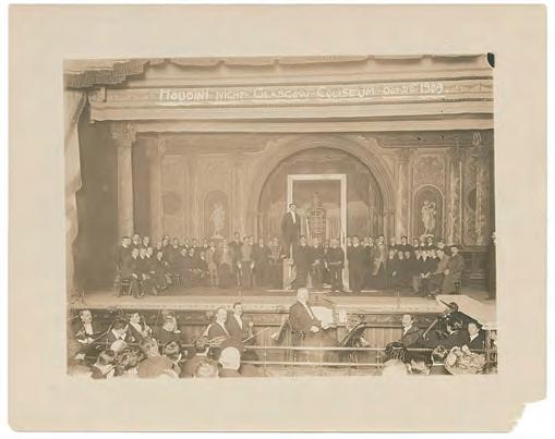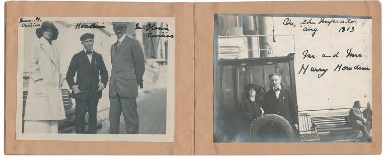number of images of Houdini over the course of his life. A tintype portrait of Houdini as a young man delivered $21,600. This ca. 1891 image was likely taken at Coney Island. He was seated on a bench and wearing a boater, bow tie, and evening clothes. The picture is perhaps the only example extant and is amongst the earliest portraits of Houdini the auction house had ever offered. A transatlantic photo album sold for $14,400. This oblong album held six total 4by-5-inch mounted silver gelatin print photos of Houdini and his wife aboard the S.S. Imperator on their trip to Europe from America on Aug. 30, 1913. A photo of Houdini and the Iron Maiden traded hands at $3,600. This sepia tone image was taken in Glasgow in 1909. It depicted the full stage of the Coliseum, where on Oct. 22, 1909, Houdini successfully escaped from a massive Iron Maiden torture device, suspended at center stage