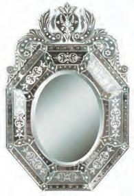 large, round, wooden-framed looking glass was decorated with carved floral ornaments at its apex and around its perimeter.