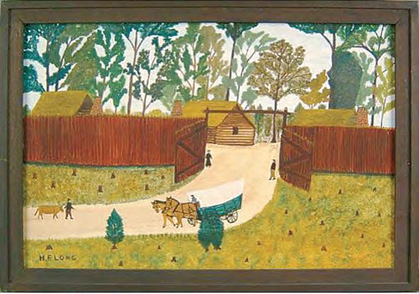 It is not known if Snyder or neighbor, artist, and antiques dealer Hattie Klapp Brunner sold Harry’s work in their shops, but Brunner did market and sell John Long reverse paintings on glass. It is known, however, that New York City antiques dealer John Gordon bought Harry’s paintings directly from him in the 1960s. Gordon was also a customer of both Brunner and Snyder. Gordon had a large sale in 1999 through Christie’s. A number of Harry Long paintings (typically signed “H.F. Long”) were in the auction, and several were passed, failing to sell. One lot, a farm scene together with a scene of the Saal buildings at the Ephrata Cloister in winter sold together for $2,990. A country landscape sold at a Slotin Auction in 2015 for $300. It was ex.