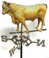 Weathervanes include Black Hawk horse by Cushing, Hackney stallion horse by J.W Fiske, full-bodied rooster by Cushing, full-bodied short horn bull by Cushing, plus more; variety of pendant sets; variety of balls, Black Swan arrow; more misc. items; FARM: 12’ early tin & sandstone