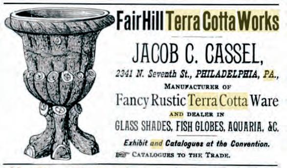 An 1889 Ad for Jacob C. Cassel’s Fair Hill Terra Cotta Works in Philadelphia, and among the products the company is advertising is rustic ware. Image courtesy The American Florist, Volume IV, 1889.