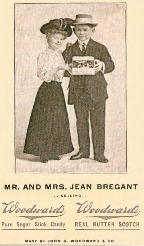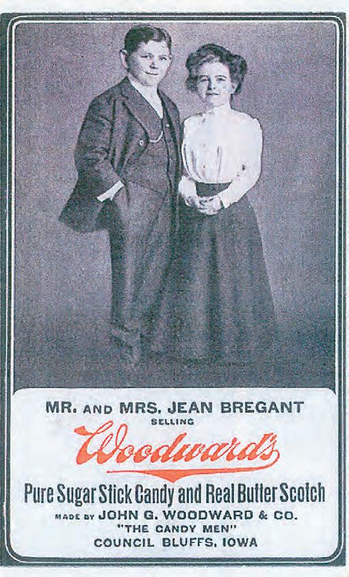 Council Bluffs candymaker John G. Woodward & Co. was known far and wide for its “pure sugar stick candy and real butterscotch.” One fateful day, the Bregants stopped by the Woodward factory to replenish their store’s candy supplies and encountered Mr. Woodward himself. Impressed by their charming personalities (as well as their show business background), Woodward offered the Bregants yet another new career, as promoters for Woodward Candy.
