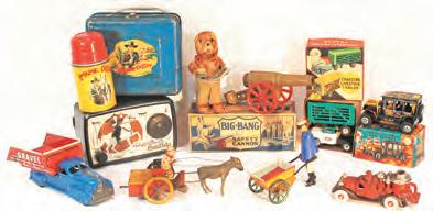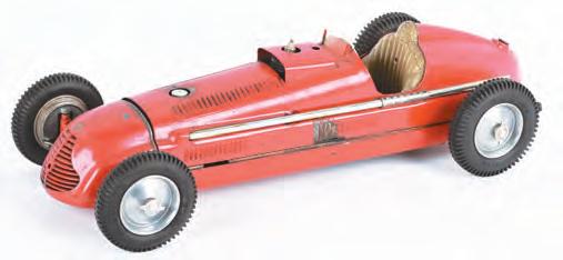 Variety was the watchword for this auction, which ran the gamut of today’s most popular toy categories, including motorcycles, racers, American cast-iron, tin and pressedsteel vehicles, German and Japanese postwar battery-ops, gas-powered tether cars, and more. Many elusive examples were in the mix, and a healthy percentage came with their desirable original boxes.