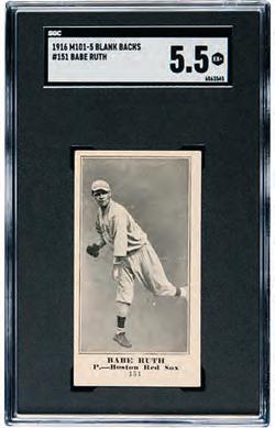 The highest-graded blankback 1916 M101-5 Babe Ruth rookie, this SGC Excellent+ example, realized $630,000.