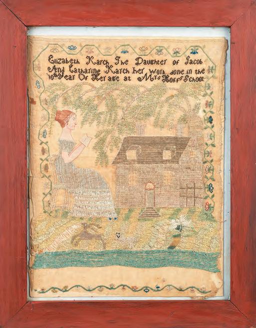 A rare Lebanon, Pa., schoolgirl needlework, ca. 1820s, inscribed “Elizabeth Karch the Daughter of Jacob and Catharine Karch her work done in the 10th year of her age at Mrs. Hoff’s School,” depicting a landscape with a seated young girl reading a book, sold for $2,000.