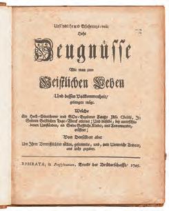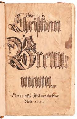 exists on private monetary donations and not supported by state tax payer funding,” noted Mohn. A treatise on spiritual life by Cloister founder Johann Conrad Beissel, 1745, a very rare work, sold for $3,000. There were three Martyrs Mirrors. One had a bookplate inscribed Christian Brennemann and printed at the Cloister in 1748 (translated from Dutch to German); it sold for $5,000. It was a prominent book for anabaptists. “A significant book,” according to Spohn,