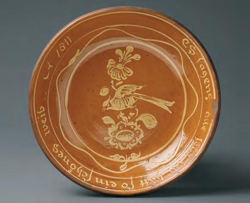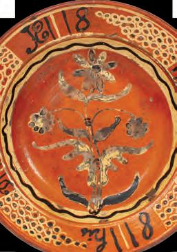 Selling for $3,500 was the southeastern Pennsylvania, late 18th century, sgraffito redware dish with glaze losses.