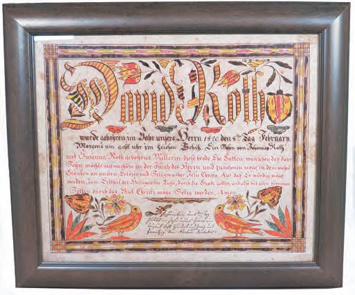 A fraktur taufshein by Abraham Brubaker, ca. 1820, in modern frame, sold to the trade for $2,900.