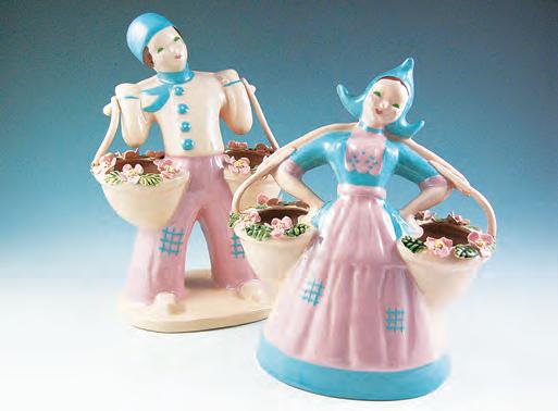 held out open aprons waiting to overflow with the flowers you’d supply, or cradled their arms in anticipation of the floral bouquets that would soon fill them. Exotic Asian figurines held oversize open fans, sleepy babies curled up next to open crescent moons, and elegant ladies lounged against opentop tree stumps or columns. There were even the occasional oddities such as the Betty Lou Nichols “Peasant” couple “Fritz and Anna,” with Fritz’s beer keg serving as a planter, or the clown (by an unnamed designer) waiting for a cactus to grace the back of his baggy pants.