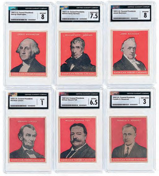 A complete 1932 U.S. Caramel set of 30 portrait/bio cards depicting American Presidents, with wax-paper wrapper title “American Heroes Caramel,” sold for $12,338 against an estimate of $1,000-$2,000.