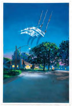 Duncan Eagleson’s 1983 commissioned original art for a pre-release one-sheet movie poster to promote slasher classic “A Nightmare on Elm Street” is acrylic with airbrushing. Artist-initialed and dated ’83, the depiction with three blades was adapted for subsequent fourblade iterations, including Matt Peak’s art for the final U.S. release poster. It went for $15,340.