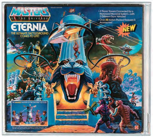 The 1986 Mattel “Masters of the Universe Eternia Series 5” playset, AFA 80 NM, one of the highest graded of all known examples, art by William George, includes three themed towers and three different battery-operated vehicles that run on the set’s monorail system, sold for $23,273 against