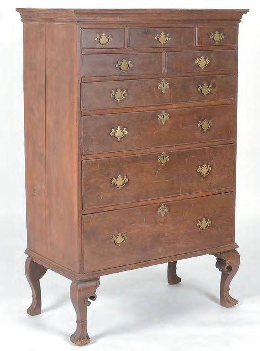hardware, and the pulls are nearly identical to a pair of wrought-iron pulls made in Chester County that are now in the Titus C. Geesey collection at the Philadelphia Museum of Art. The turned feet, top central section of the cornice molding, and keystone are the only noted restorations.