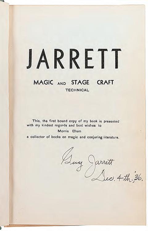 20-percent buyer’s premium. The top lot in this Houdiniana sale was Guy Jarrett’s (1881-1972) book “Jarrett. Magic and Stage Craft Technical.” Estimated at $6,0009,000, it made a breathtaking $60,000. It was self-published by the author in 1936 in New York. This example was both a presentation