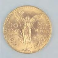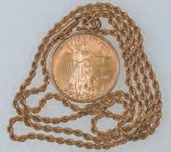 An American Gold Eagle pendant consisting of a 2014 $50 one-ounce gold piece in a reeded bezel with a 30inch 14-carat chain weighing 27.7 grams (the coin weighed 33.931 grams) brought $4,500.