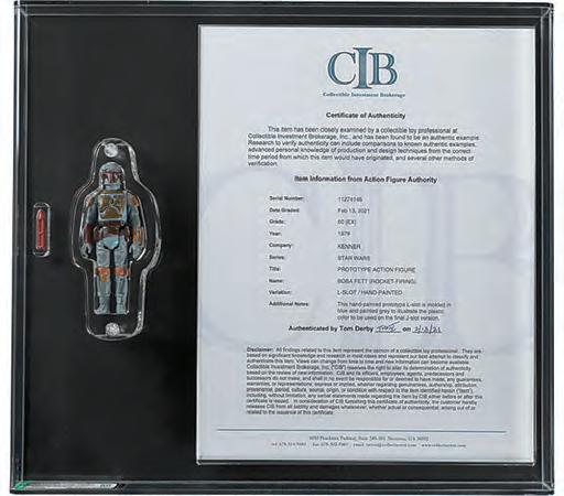 L-shaped latch in the back, of which there are some 70 known examples of the surviving 100 (or so) prototypes. As longtime “Star Wars” expert and dealer Brian Rachfal notes in his letter of provenance, “It’s uncertain exactly how many Rocket Firing Boba Fetts were created,” or survive 45 years later. But this is absolutely among the rarest.