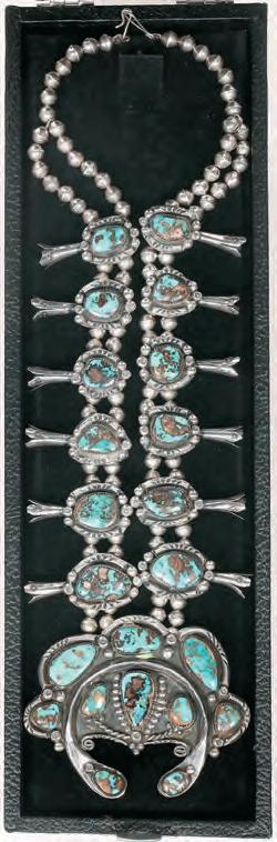 A fine squash blossom necklace with dark blue turquoise in a dark brown to black matrix, crafted ca. 1960 by Jimmy Long, the spouse of Navajo silversmith Helen Long, sold for $3,250.