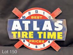 SIGNS INCLUDING A LINCOLN TELEPHONE & TELEGRAPH LOCAL & LONG DISTANCE TWO-SIDED PORCELAIN FEATURING A STICK TELEPHONE. RAILWAY EXPRESS AGENCY SIGNS. 1940’S DRINK COCA-COLA “DELICIOUS & REFRESHING” METAL SIGN. TWO LARGE WALL SIZE UNIROYAL METAL SIGNS, FRAM THERMOMETER, MOHAWK TIRES METAL SIGN, TUBELESS TIRE SERVICE SIGN. TRICO WIPER BLADE LIGHT UP SIGN, CITGO SIGN. CHAMPION SPARK PLUG SERVICE STAND, TALL MULTI DRAWER PARTS CABINET MARKED LOCKHEED HYDRAULIC REPAIR PARTS. ATLANTIC MOTOR OIL LUBESTER PUMP, TRICO WIPER BLADE ROLLING CART, FEDERAL MOGUL BOWER BEARING & NATIONAL OIL SEAL PARTS CABINET, TOKHEIM 39 GAS PUMP, VINTAGE WOODWORK BENCHES, SWINGSPOUT DISPLAY RACK, REBAT BATTERY DISPLAY SHELF, ATLAS METAL CABINET, MONROE SHOCK ABSORBER DISPLAY, MONROE STOOL, TEXACO HAVOLINE STOOL & MORE. OIL BOTTLES WITH CARRIER, GAS CANS.