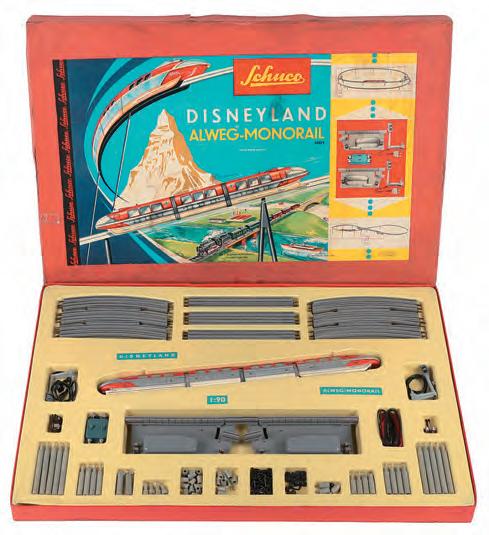 The 1962 Schuco 6333 Disneyland Alweg-Monorail G-Set, marked “Disneyland” and “Schuco” on all parts, with track, cable, supports, a three-piece model monorail and original box, sold for $2,124.