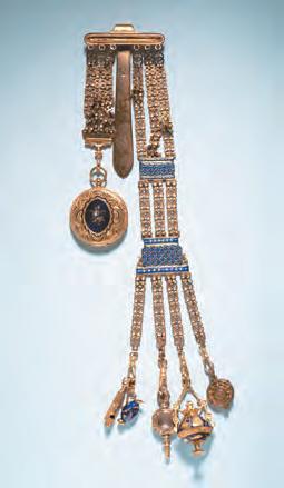 Complete with a pocket watch, this ornate gold and cobalt chatelaine marked “18K” brought $3,500.