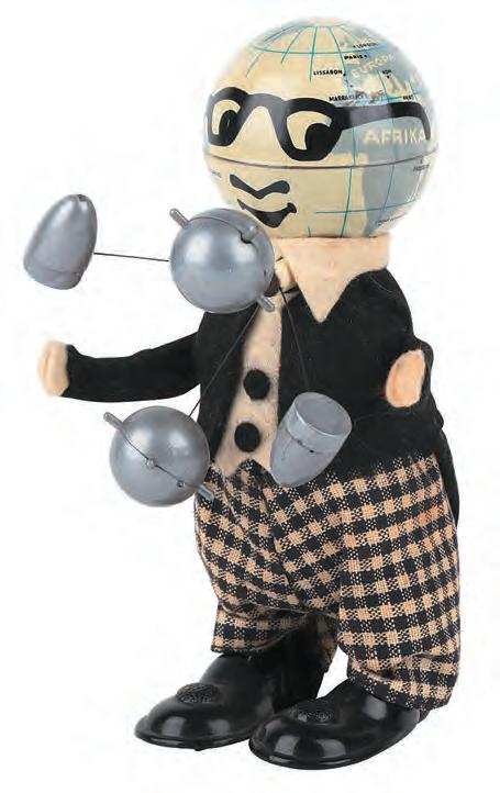 A 1950s Schuco No. 967 Mister Atom tin and cloth juggling toy with wind-up tin plate globe head, juggling plastic satellites and plastic feet, five feet tall, tested and working, sold for $1,888.