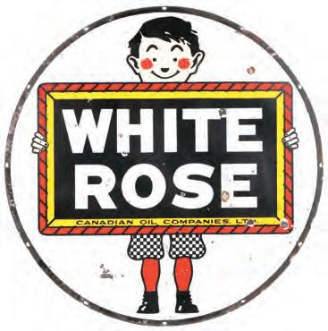 The 1940s Canadian White Rose “Slate Boy” double-sided porcelain service station sign, impressive at four feet in diameter and featuring “Boy and Slate” graphic, sold for $17,700.