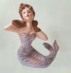 mermaids can be found as long ago as 1600 B.C., frolicking on Mesopotamian cylinder seals. Sculptures, statues, and artwork from every era since are proof positive that the siren’s song continues to entrance. Mid-20thcentury artisans found mermaids particularly alluring subjects. Whether ceramic or glass, metal or metal-like, there were plenty of mass-produced mermaids ready to brighten the beach cottage bath with their charms. Many were overseas imports; inexpensive then, most still remain in the $50-$75 range. Numerous design names of note, including Van Briggle, Florence Ceramics, and Marc Bellaire, also took the plunge into mermaid decor. Due to their lineage, these artifacts are more pricey, though few top out at over $200. And, if you want to pool your resources, you can always invest in a pricier item, like a mermaid coffee table, with a full-size metal mermaid supporting a glass top.