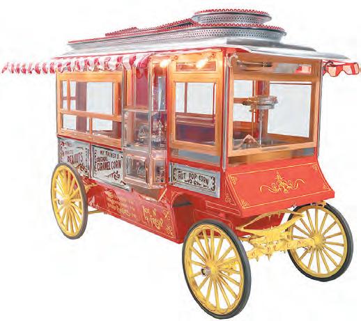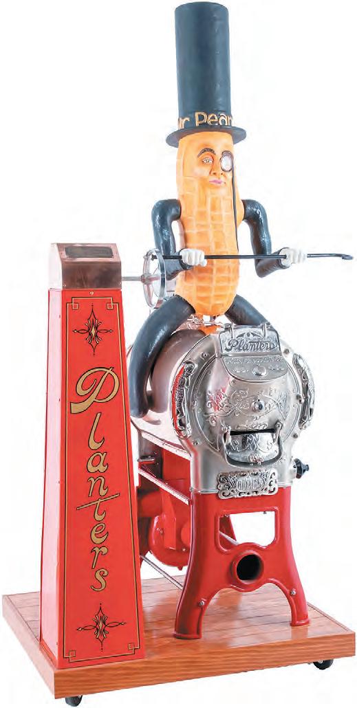 A ca. 1905 Cretors & Company Model D horsedrawn popcorn wagon soared to $86,100, a late 19th-/early 20th-century owl “Cigar Store” reversepainted glass sign topped out at $68,880, and a ca. 1920 Mr. Peanut “Red” Royal cast-iron peanut roaster realized $67,650 at Morphy’s General Antiques and Adv ertising Auction held Dec. 4 to 6.