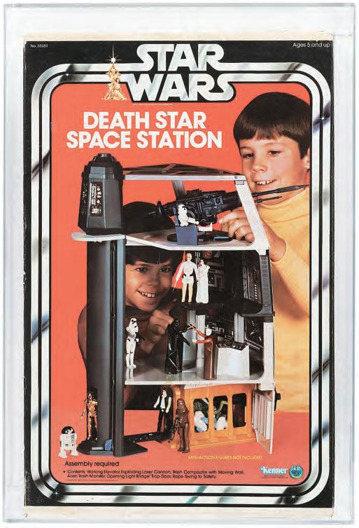 Another auction entry that was designed to stoke a youngster’s imagination is Kenner’s “Star Wars” Death Star Space Station playset, AFA-graded 85 NM+. Its long list of accessories, as detailed on the box, includes “Working Elevator, Exploding Laser Cannon, Trash Compactor with Moving Wall, Alien Trash Monster, Opening Light Bridge, Trap Door and Rope