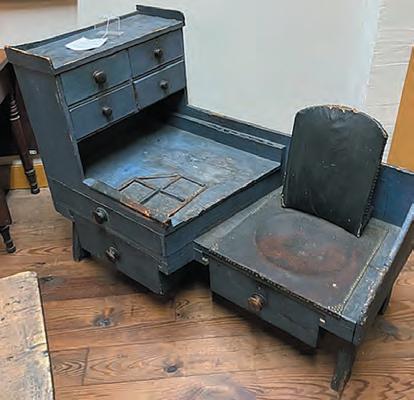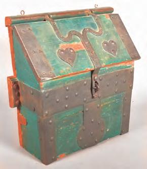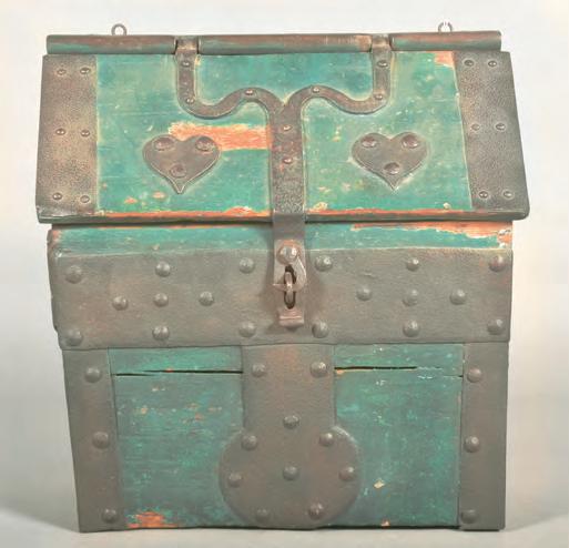 decoration and support to the box. Beautiful Prussian blue paint with a rich patina appears to be covering earlier coats of paint. In next week’s issue, we’ll examine another interesting lot from this large sale. To learn more, call Conestoga Auction Company at 717-898-7284. consignor. The toolbox itself is an amazing illustration of a blacksmith’s work. A pair of wrought iron hearts flank the center hasp, acting as a great embellishment to the lid. Wrought iron bands and rosehead nails provide both