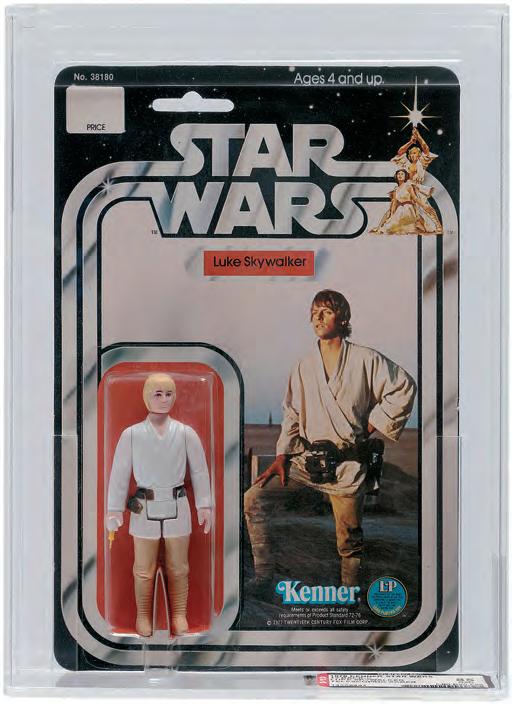 A “Star Wars” (1978) Double-Telescoping Luke Skywalker 12 Back-C action figure, AFA 85 NM+, is an expected highlight. At time of cataloging, only eight clear blister examples were recorded in an AFA 85 grade according to current AFA Population Report, with just three graded higher. A highly coveted book example, it appears in “Star Wars Vintage Action Figures: A Guide For Collectors” by John Kellerman.